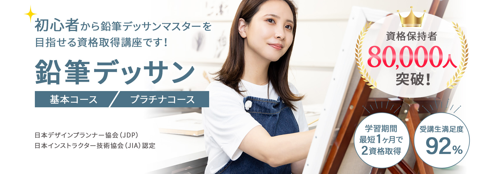 はじめてデッサンアートを学ぶ方でも、ムリなく学べるオリジナル教材!プロが監修した教材と充実のカリキュラムでデッサンアート資格講座の平均合格率は、80%以上(23年11月時点、自社調べ)です。(プラチナコース卒業生は資格取得100%)
