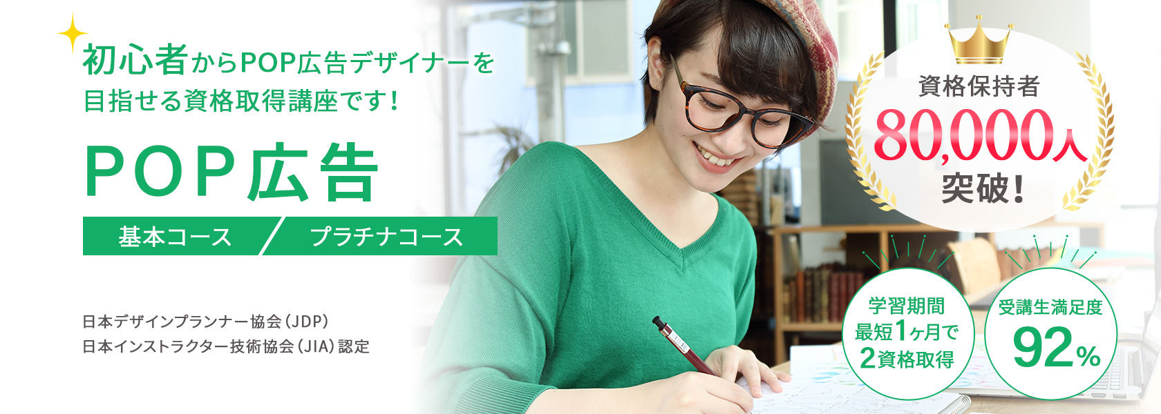 はじめてPOP広告を学ぶ方でも、ムリなく学べるオリジナル教材!プロが監修した教材と充実のカリキュラムでPOP広告資格講座の平均合格率は、80%以上(23年11月時点、自社調べ)です。(プラチナコース卒業生は資格取得100%)