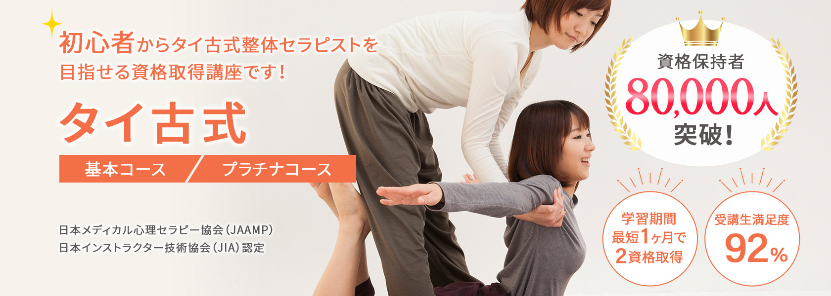 はじめてタイ古式を学ぶ方でも、ムリなく学べるオリジナル教材!プロが監修した教材と充実のカリキュラムでタイ古式資格講座の平均合格率は、80%以上(23年11月時点、自社調べ)です。(プラチナコース卒業生は資格取得100%)