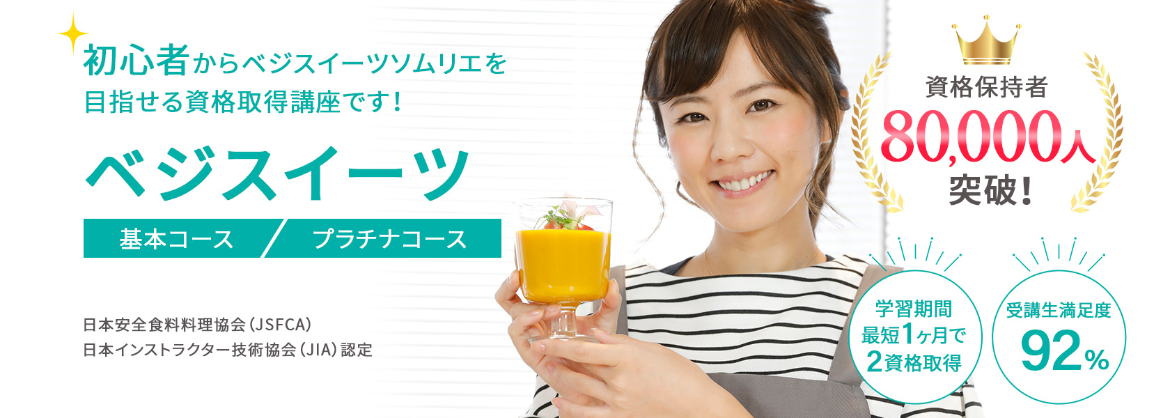 はじめてベジスイーツを学ぶ方でも、ムリなく学べるオリジナル教材!プロが監修した教材と充実のカリキュラムでベジスイーツ資格講座の平均合格率は、80%以上(23年11月時点、自社調べ)です。(プラチナコース卒業生は資格取得100%)