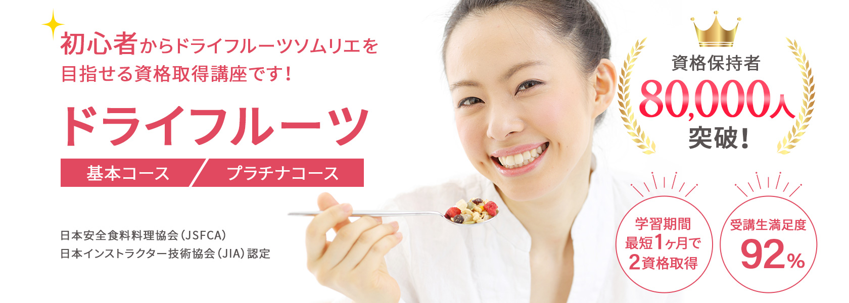 はじめてドライフルーツを学ぶ方でも、ムリなく学べるオリジナル教材!プロが監修した教材と充実のカリキュラムでドライフルーツ資格講座の平均合格率は、80%以上(23年11月時点、自社調べ)です。(プラチナコース卒業生は資格取得100%)
