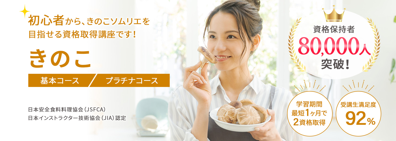 本講座では日本安全食料料理協会(JSFCA)主催の「きのこソムリエ資格」、日本インストラクター技術協会(JIA)主催の「菌類インストラクター資格」の2つの資格に対応しています。得点率70%以上で合格となり、自宅でも受けることができます。プラチナコースを選択すれば、卒業課題提出で、試験免除で資格が認定されるので、資格を100%取得できます!