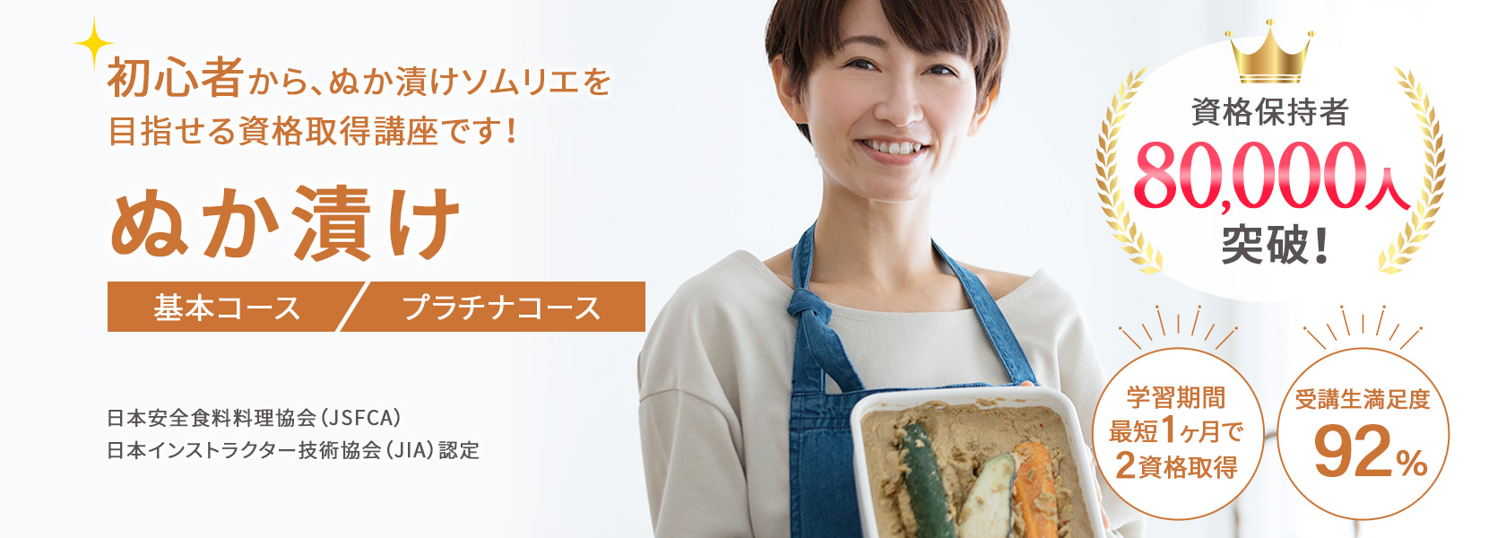 はじめてぬか漬けを学ぶ方でも、ムリなく学べるオリジナル教材!プロが監修した教材と充実のカリキュラムでぬか漬け資格講座の平均合格率は、80%以上(23年11月時点、自社調べ)です。(プラチナコース卒業生は資格取得100%)