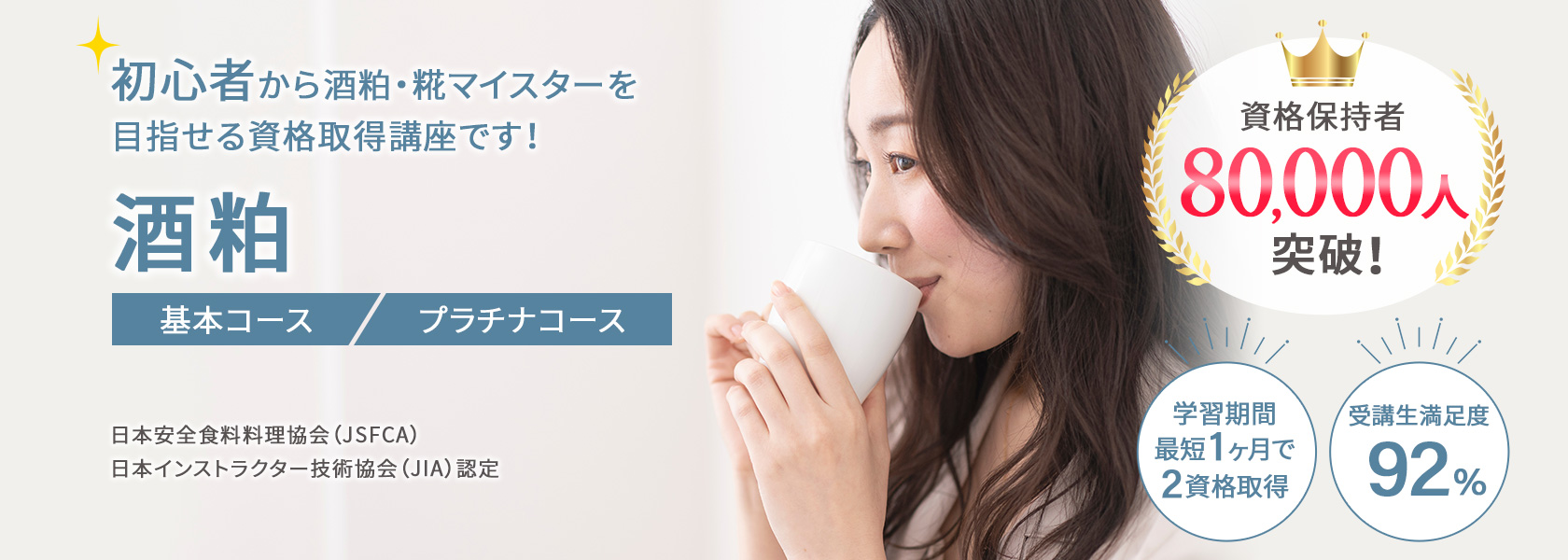 はじめて酒粕を学ぶ方でも、ムリなく学べるオリジナル教材!プロが監修した教材と充実のカリキュラムで酒粕資格講座の平均合格率は、80%以上(23年11月時点、自社調べ)です。(プラチナコース卒業生は資格取得100%)