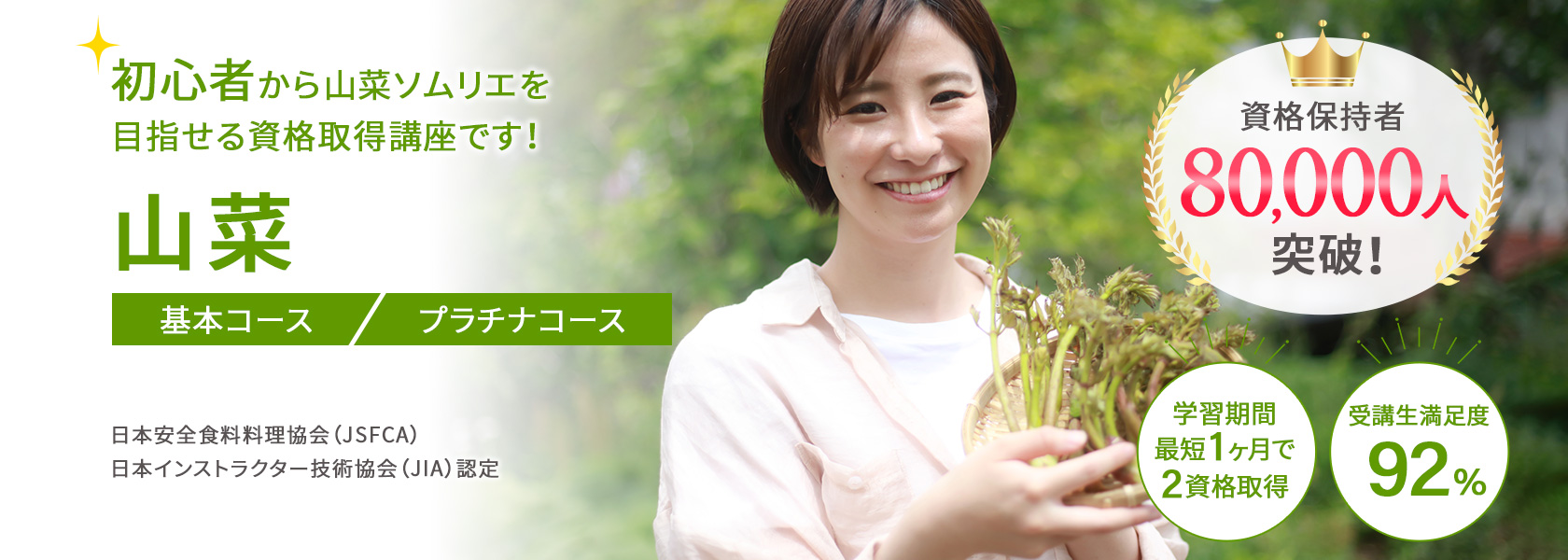 はじめて山菜を学ぶ方でも、ムリなく学べるオリジナル教材!プロが監修した教材と充実のカリキュラムで山菜資格講座の平均合格率は、80%以上(23年11月時点、自社調べ)です。(プラチナコース卒業生は資格取得100%)