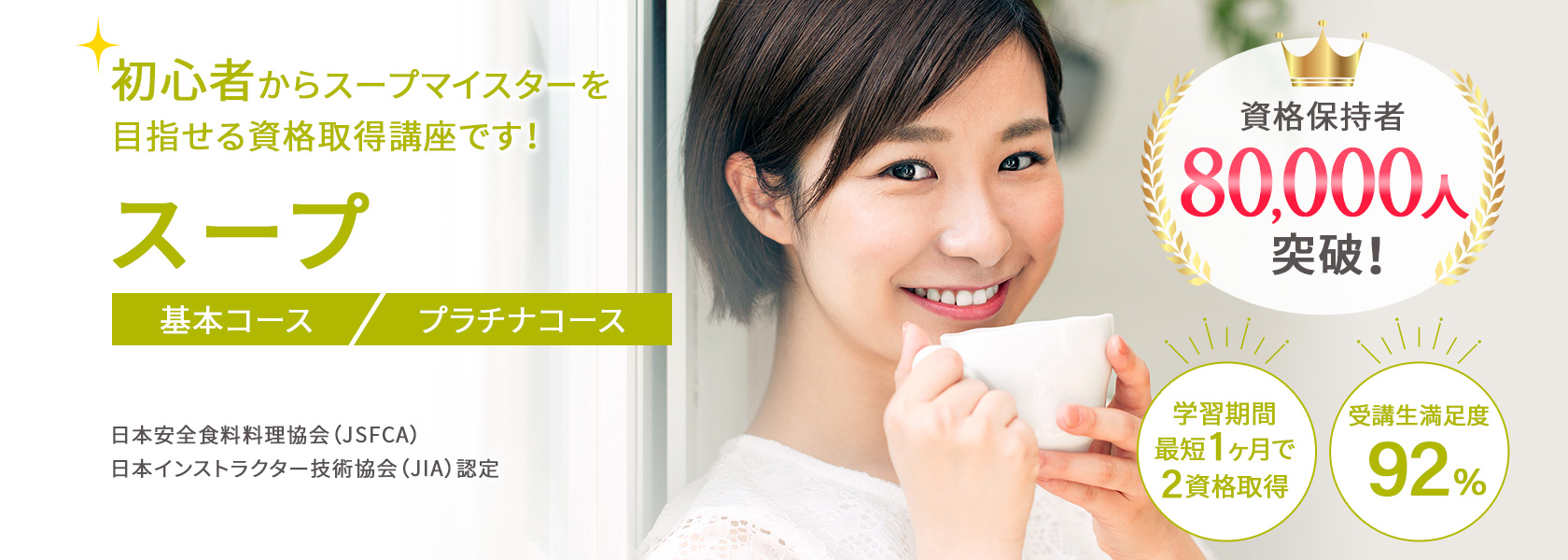 はじめてスープを学ぶ方でも、ムリなく学べるオリジナル教材!プロが監修した教材と充実のカリキュラムでスープ資格講座の平均合格率は、80%以上(23年11月時点、自社調べ)です。(プラチナコース卒業生は資格取得100%)