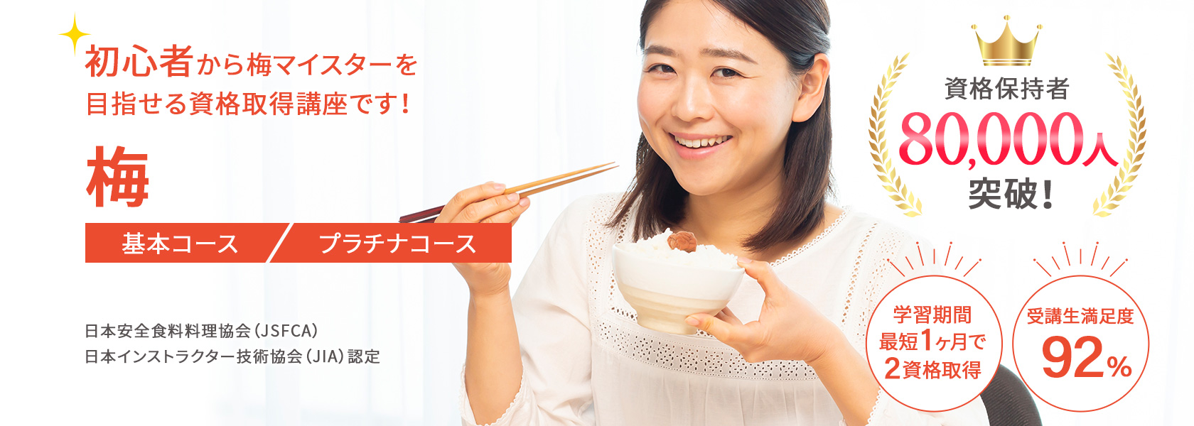 はじめて梅を学ぶ方でも、ムリなく学べるオリジナル教材!プロが監修した教材と充実のカリキュラムで梅資格講座の平均合格率は、80%以上(23年11月時点、自社調べ)です。(プラチナコース卒業生は資格取得100%)