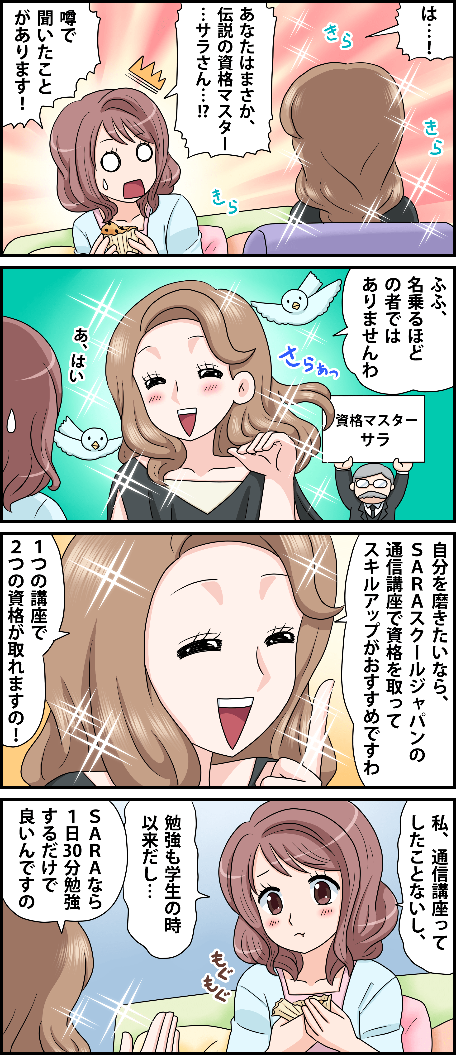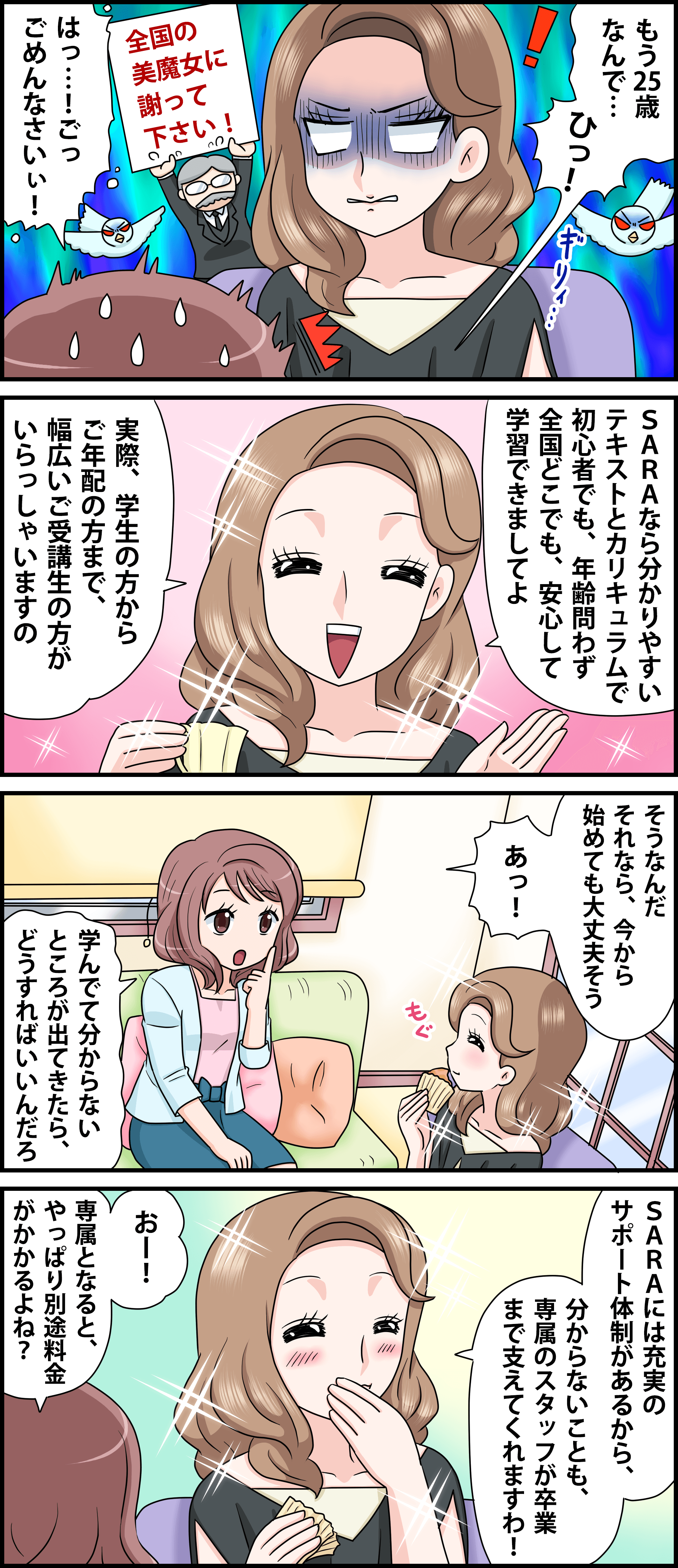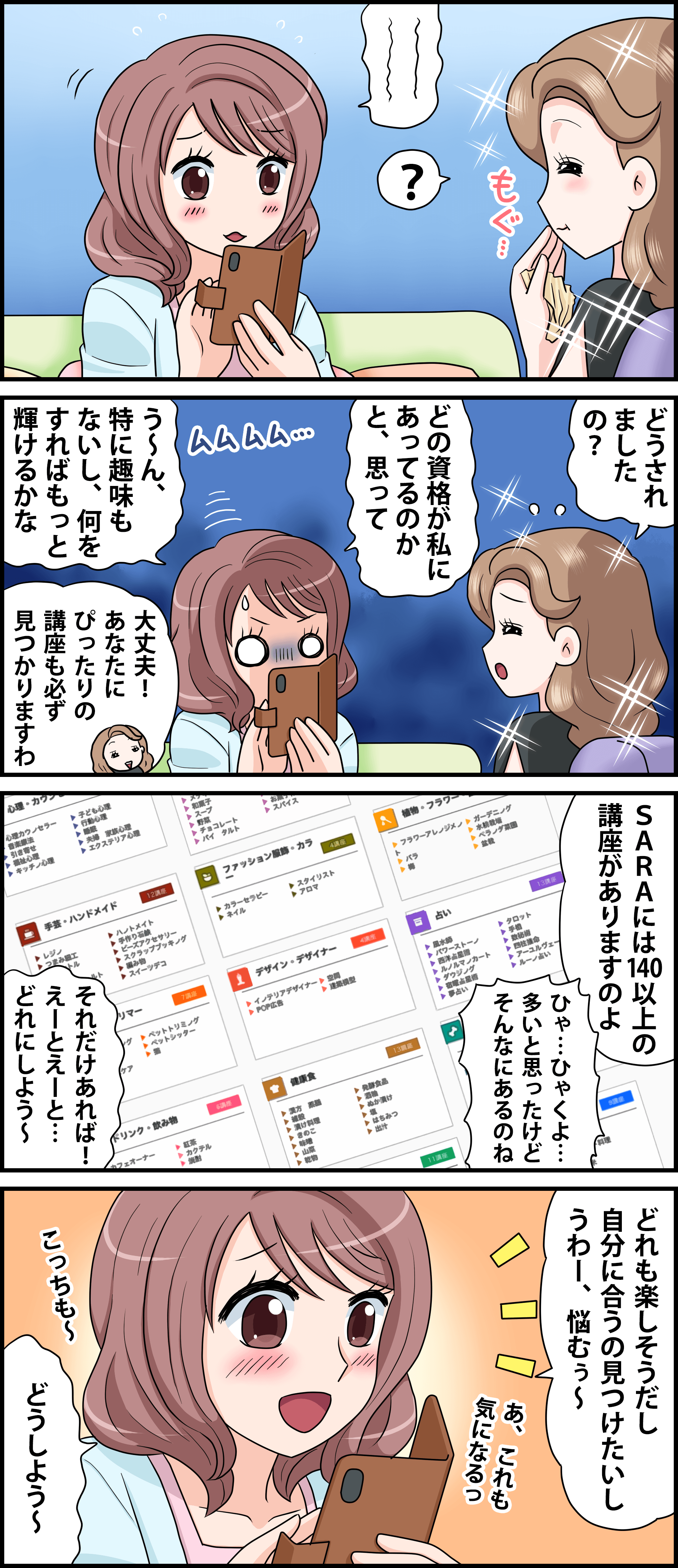 SARA とは、女王、高貴な女性という意味があります。 女性の活躍、自分を変えたい、綺麗になりたい、キャリアアップしたい、 自立したいなどの為に役立つ講座、充実した人生を送るための趣味講座や なりたい自分になる講座、副業やお小遣い稼ぎに役立つ講座など 140 講座以上の人気講座を揃えています。
