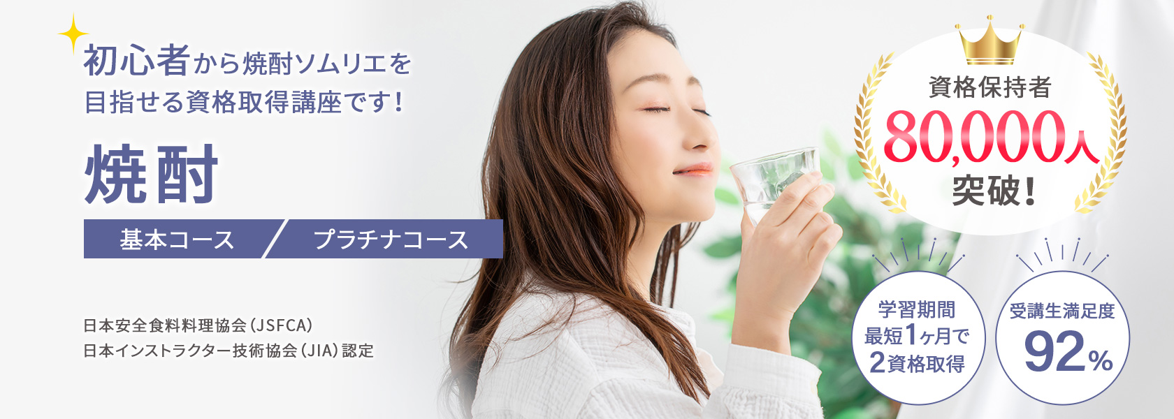 はじめて焼酎を学ぶ方でも、ムリなく学べるオリジナル教材!プロが監修した教材と充実のカリキュラムで焼酎資格講座の平均合格率は、80%以上(23年11月時点、自社調べ)です。(プラチナコース卒業生は資格取得100%)