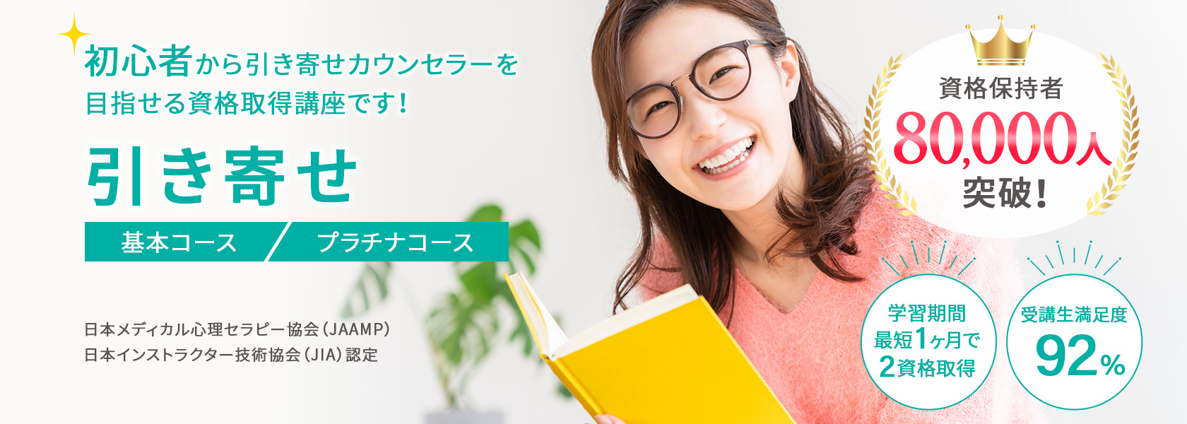 はじめて引き寄せを学ぶ方でも、ムリなく学べるオリジナル教材!プロが監修した教材と充実のカリキュラムで引き寄せ資格講座の平均合格率は、80%以上(23年11月時点、自社調べ)です。(プラチナコース卒業生は資格取得100%)