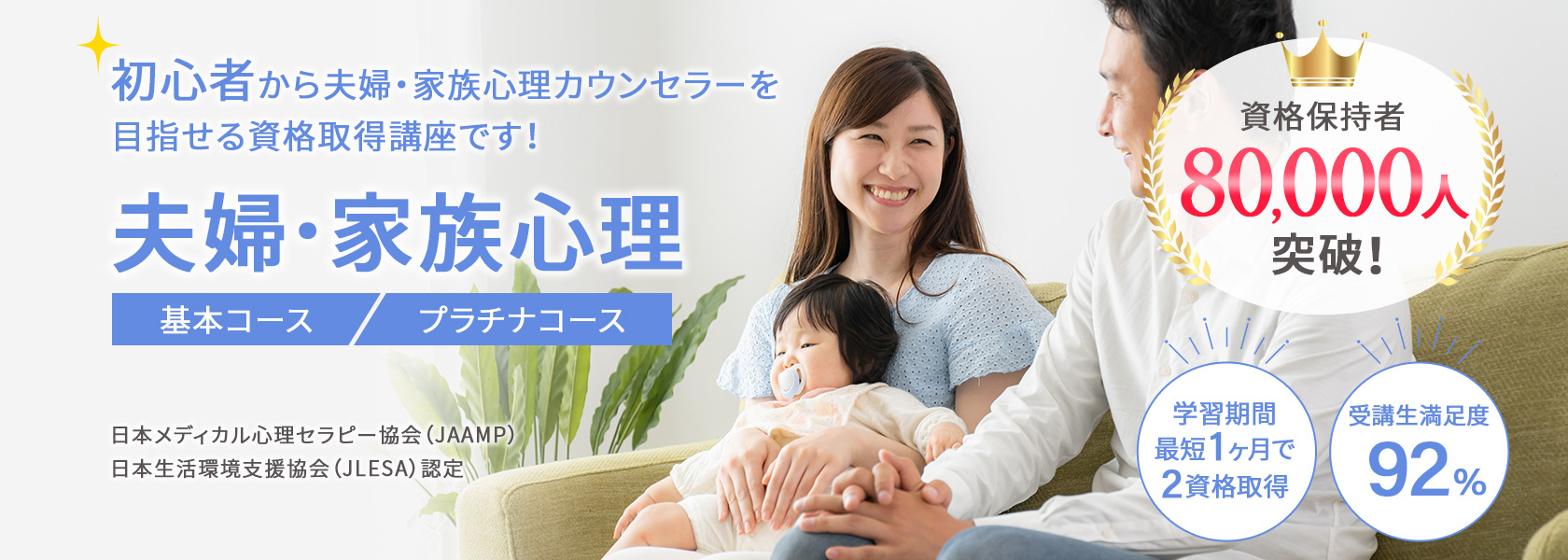 はじめて夫婦・家族心理を学ぶ方でも、ムリなく学べるオリジナル教材!プロが監修した教材と充実のカリキュラムで夫婦・家族心理資格講座の平均合格率は、80%以上(23年11月時点、自社調べ)です。(プラチナコース卒業生は資格取得100%)