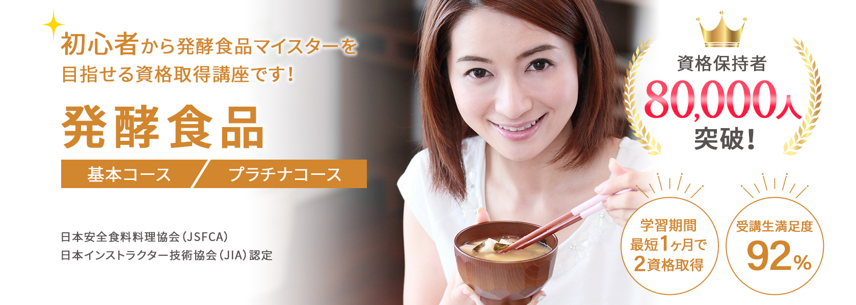 はじめて発酵食品を学ぶ方でも、ムリなく学べるオリジナル教材!プロが監修した教材と充実のカリキュラムで発酵食品資格講座の平均合格率は、80%以上(23年11月時点、自社調べ)です。(プラチナコース卒業生は資格取得100%)