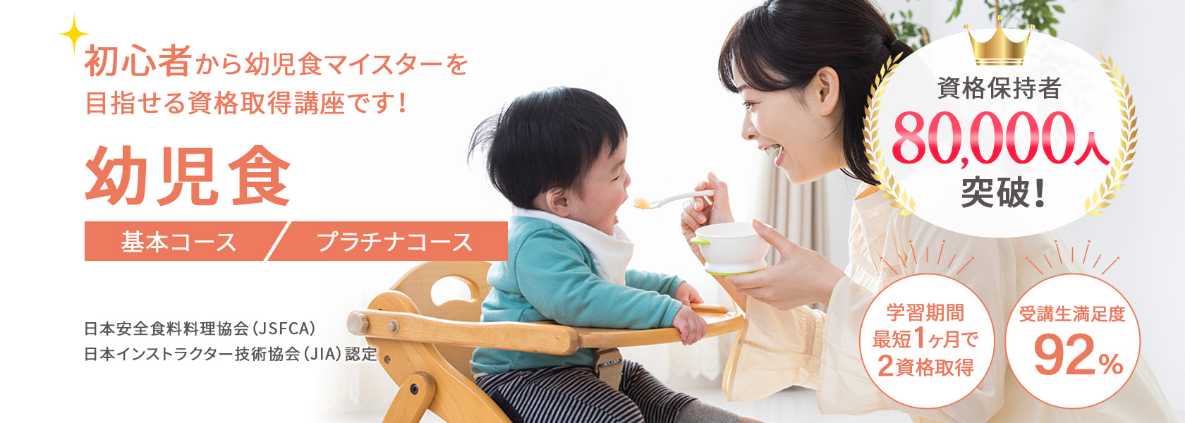 はじめて幼児食を学ぶ方でも、ムリなく学べるオリジナル教材!プロが監修した教材と充実のカリキュラムで幼児食資格講座の平均合格率は、80%以上(23年11月時点、自社調べ)です。(プラチナコース卒業生は資格取得100%)