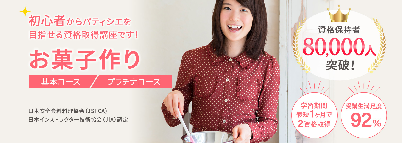 はじめてお菓子作りを学ぶ方でも、ムリなく学べるオリジナル教材!プロが監修した教材と充実のカリキュラムでお菓子作り資格講座の平均合格率は、80%以上(23年11月時点、自社調べ)です。(プラチナコース卒業生は資格取得100%)
