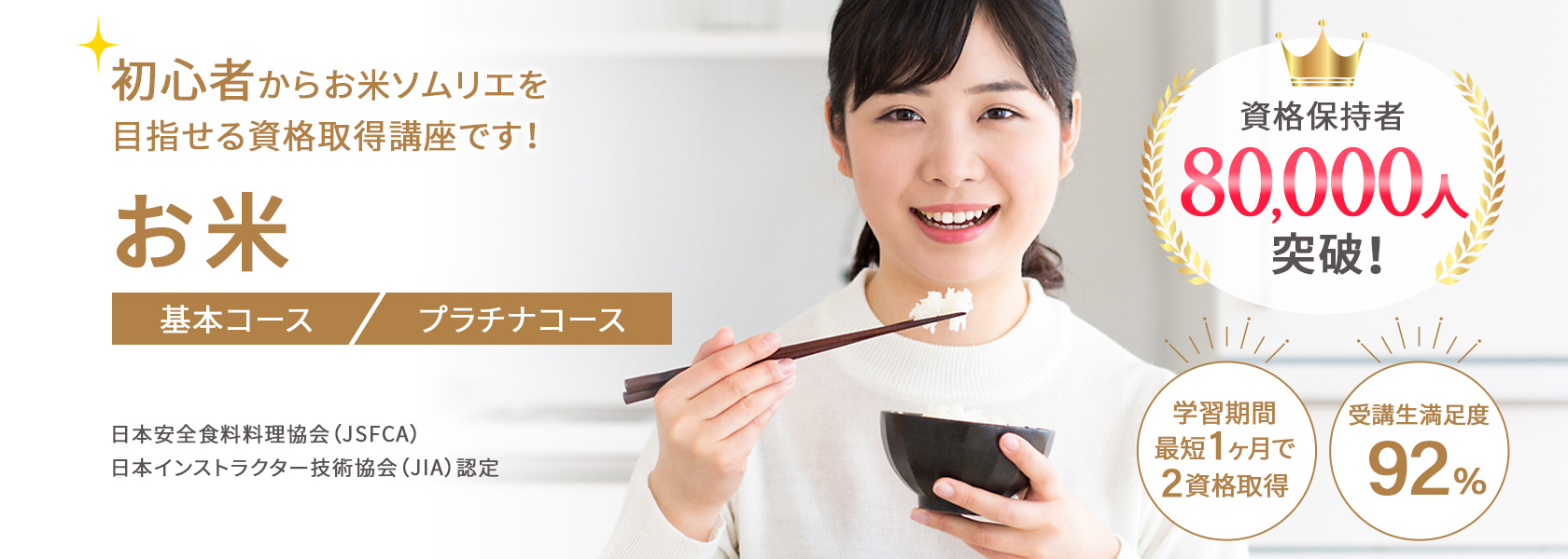 はじめてお米を学ぶ方でも、ムリなく学べるオリジナル教材!プロが監修した教材と充実のカリキュラムでお米資格講座の平均合格率は、80%以上(23年11月時点、自社調べ)です。(プラチナコース卒業生は資格取得100%)