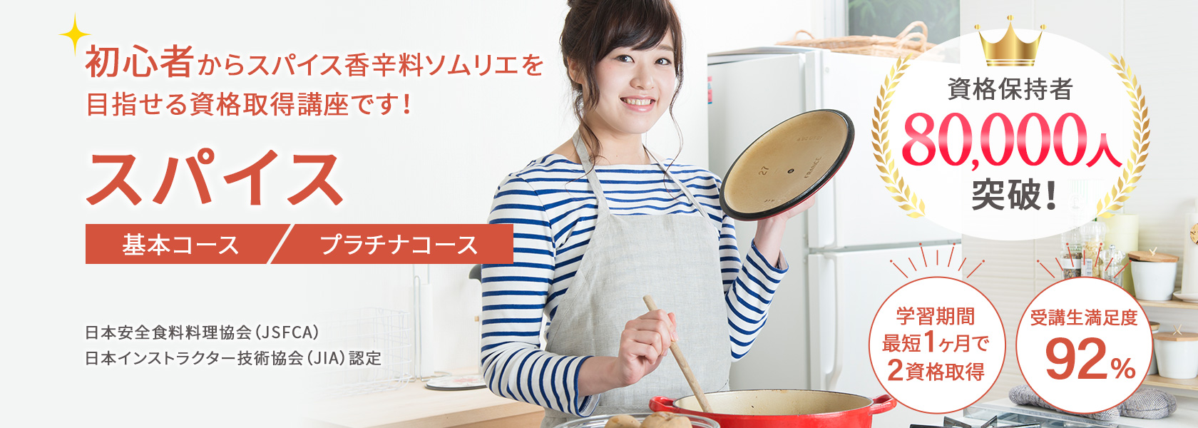 はじめてスパイスを学ぶ方でも、ムリなく学べるオリジナル教材!プロが監修した教材と充実のカリキュラムでスパイス資格講座の平均合格率は、80%以上(23年11月時点、自社調べ)です。(プラチナコース卒業生は資格取得100%)
