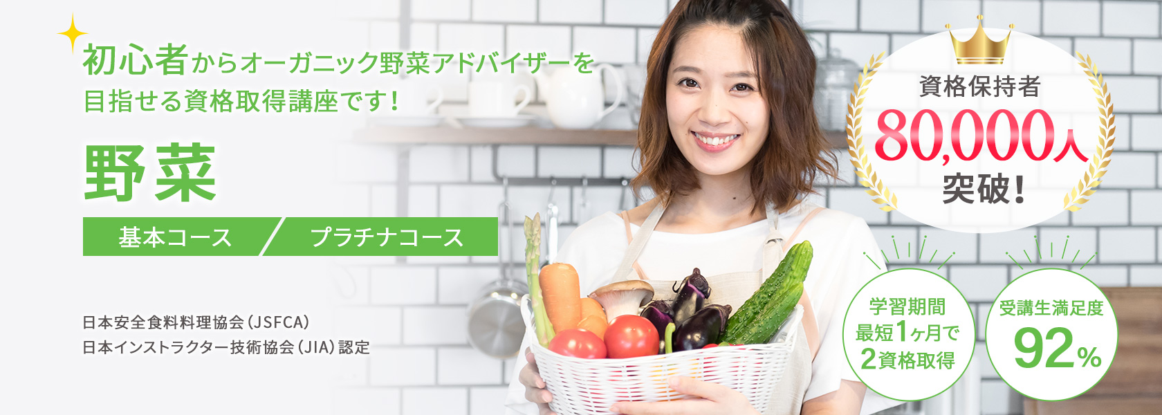 はじめて野菜を学ぶ方でも、ムリなく学べるオリジナル教材!プロが監修した教材と充実のカリキュラムで野菜資格講座の平均合格率は、80%以上(23年11月時点、自社調べ)です。(プラチナコース卒業生は資格取得100%)