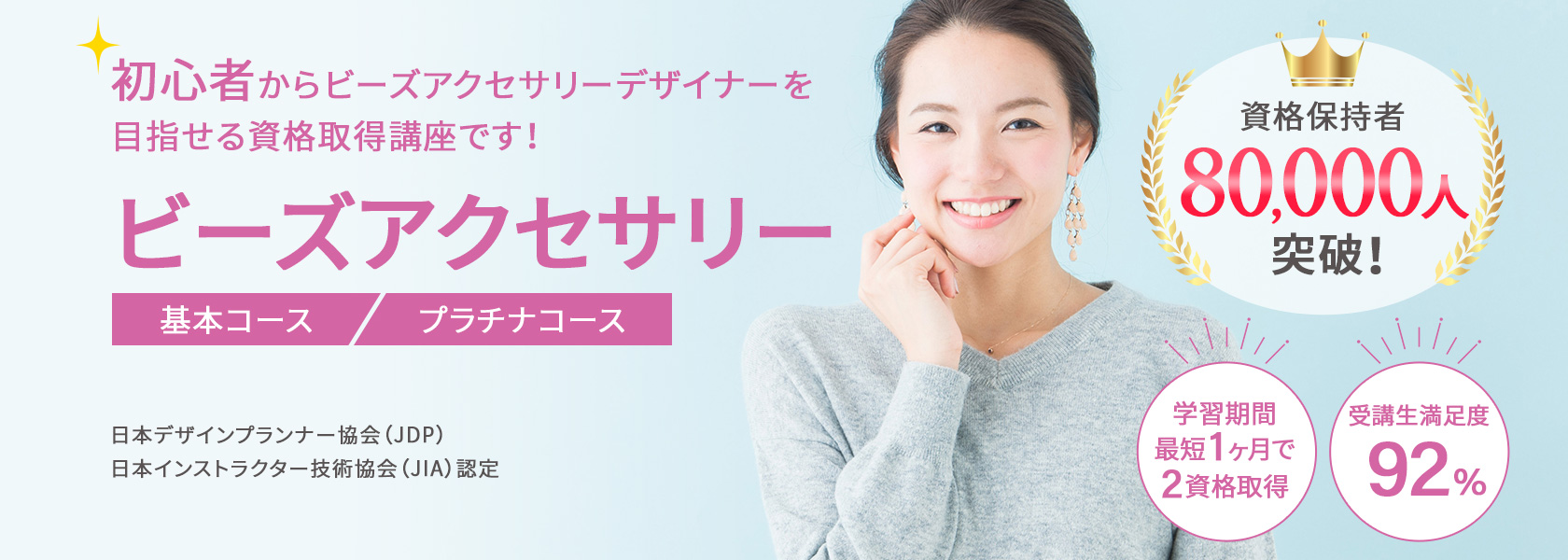 はじめてビーズアクセサリーを学ぶ方でも、ムリなく学べるオリジナル教材!プロが監修した教材と充実のカリキュラムでビーズアクセサリー資格講座の平均合格率は、80%以上(23年11月時点、自社調べ)です。(プラチナコース卒業生は資格取得100%)