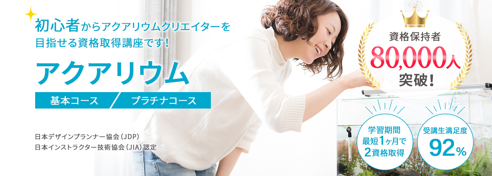 はじめてアクアリウムを学ぶ方でも、ムリなく学べるオリジナル教材!プロが監修した教材と充実のカリキュラムでアクアリウム資格講座の平均合格率は、80%以上(23年11月時点、自社調べ)です。(プラチナコース卒業生は資格取得100%)