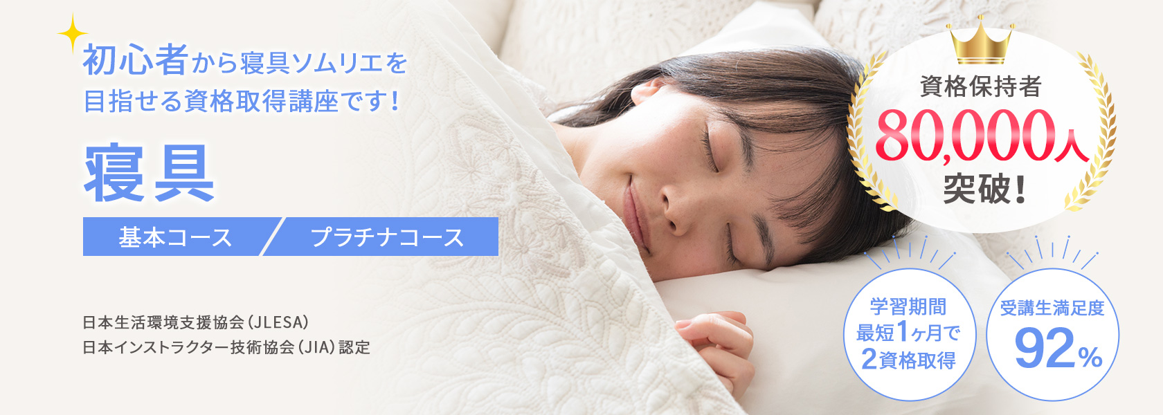 はじめて寝具を学ぶ方でも、ムリなく学べるオリジナル教材!プロが監修した教材と充実のカリキュラムで寝具資格講座の平均合格率は、80%以上(23年11月時点、自社調べ)です。(プラチナコース卒業生は資格取得100%)