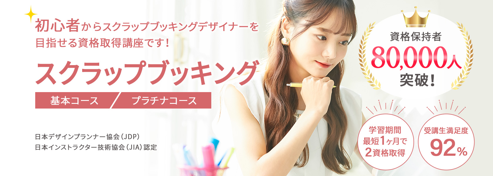 はじめてスクラップブッキングを学ぶ方でも、ムリなく学べるオリジナル教材!プロが監修した教材と充実のカリキュラムでスクラップブッキング資格講座の平均合格率は、80%以上(23年11月時点、自社調べ)です。(プラチナコース卒業生は資格取得100%)