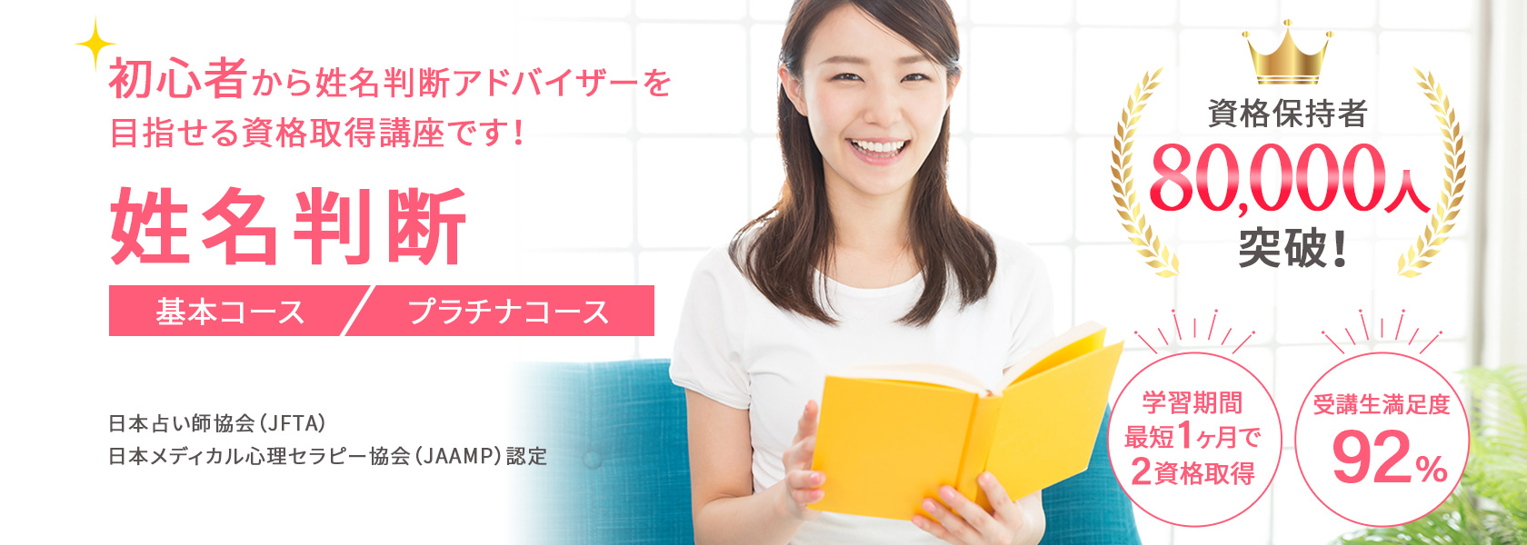 はじめて姓名判断を学ぶ方でも、ムリなく学べるオリジナル教材!プロが監修した教材と充実のカリキュラムで姓名判断資格講座の平均合格率は、80%以上(23年11月時点、自社調べ)です。(プラチナコース卒業生は資格取得100%)