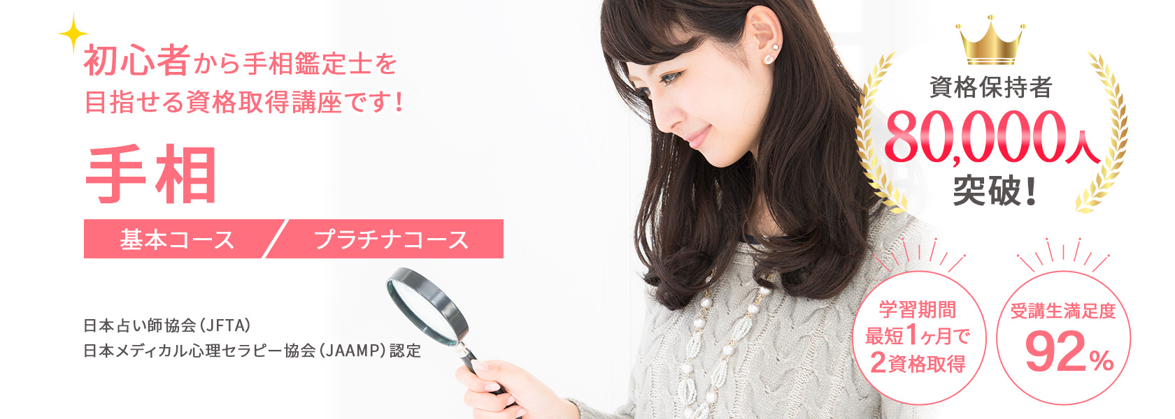 はじめて手相を学ぶ方でも、ムリなく学べるオリジナル教材!プロが監修した教材と充実のカリキュラムで手相資格講座の平均合格率は、80%以上(23年11月時点、自社調べ)です。(プラチナコース卒業生は資格取得100%)